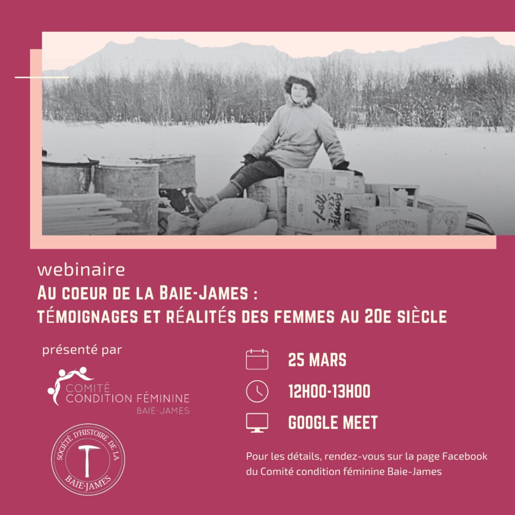 En collaboration avec la Société d’histoire de la Baie-James, un 5 à 7 a été organisé le 13 mars dans le cadre de la Journée internationale des droits des femmes dans les locaux de la SHBJ. Les participant.e.s ont assisté à une conférence basée sur un rapport de recherche de la SHBJ qui porte sur les conditions de vie matérielles, le contexte d’arrivée dans la région, les emplois et les services accessibles aux femmes entre 1900 et 1987. La conférence présentée lors du 5 à 7 a fait l’objet d’une présentation virtuelle le 25 mars.