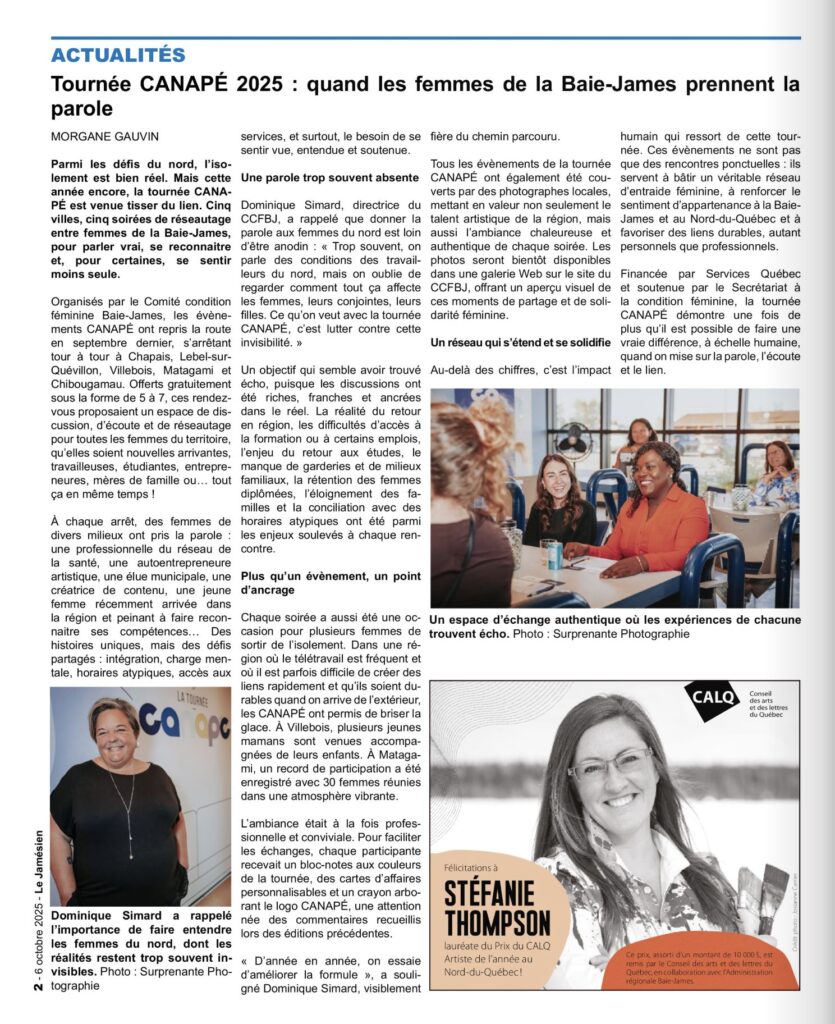 « Cette édition a une fois de plus démontré toute la force du réseautage entre femmes. L’énergie, la solidarité et la richesse des échanges confirment que CANAPÉ répond à un véritable besoin dans la région », souligne Dominique Simard, directrice du CCFBJ.